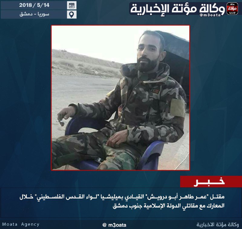 *- מפקד שדה בחטיבת אלקודס הפלשתינית נהרג בקרבות במחנה ירמוק.