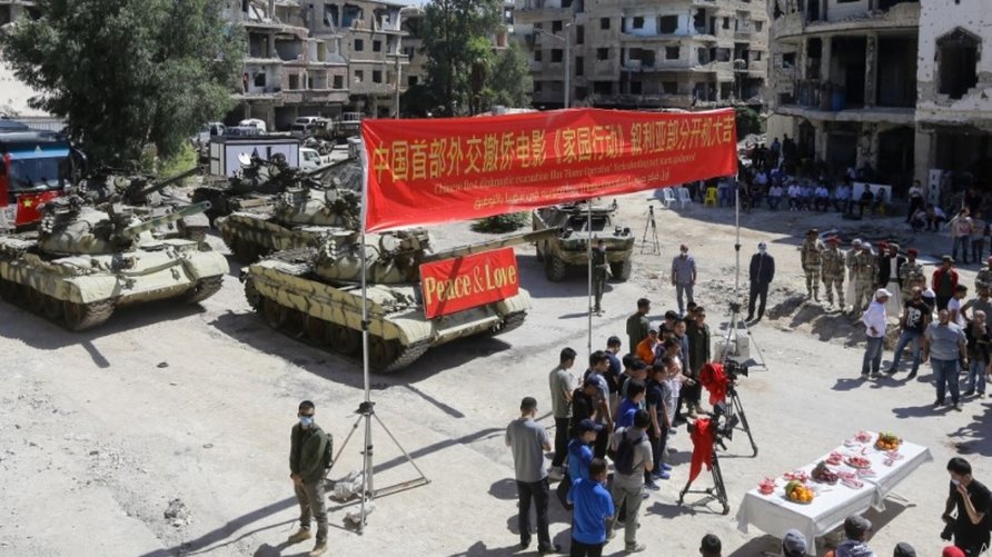 הופעת הפרסומים הללו מגיעה לאחר שצילומי “מבצע ביתי” – “هوم أوبرايشن” – HOME OPERATION, הסרט הסיני הראשון שצולם בסוריה, החלו, ביום חמישי, ובהשראת פינוי אזרחים זרים וסינים מתימן על ידי סין ב-2015בעקבות פריצת מלחמת אזרחים שקרעה את המדינה בין מספר עדות והרסה את כלכלת המדינה עד היסוד.