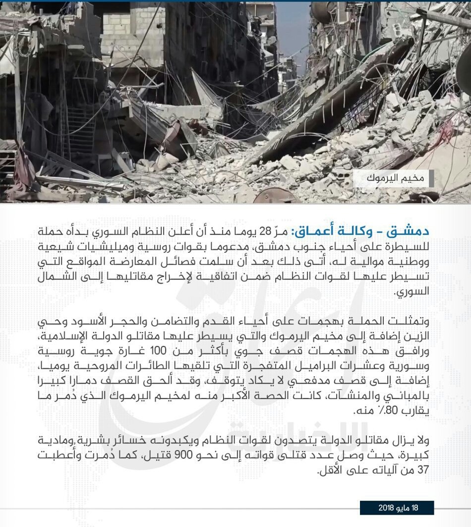 *- זה היום ה-28 שצבא סוריה תוקף את מחנה ירמוק על מנת לעקור ממנו את כוחות דאעש אך ללא הצלחה. דבר אחד כן הצליח הצבא הסורי לעשות בהצטיינות יתרה: יותר מ-80% מבתי המחנה נהרסו ללא תקנה.