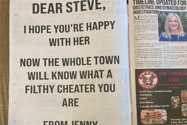 Weekly Mackay and Whitsunday Life פרסמו את התמונה בפייסבוק לאחר שהוצפה בפניות על הפרסומת המוזרה והשנויה במחלוקת, שבה נכתב: “סטיב היקר, אני מקווה שאתה מרוצה ממנה, עכשיו, כל העיר תדע כמה אתה בוגד ווולגרי הם… מג’ני.”