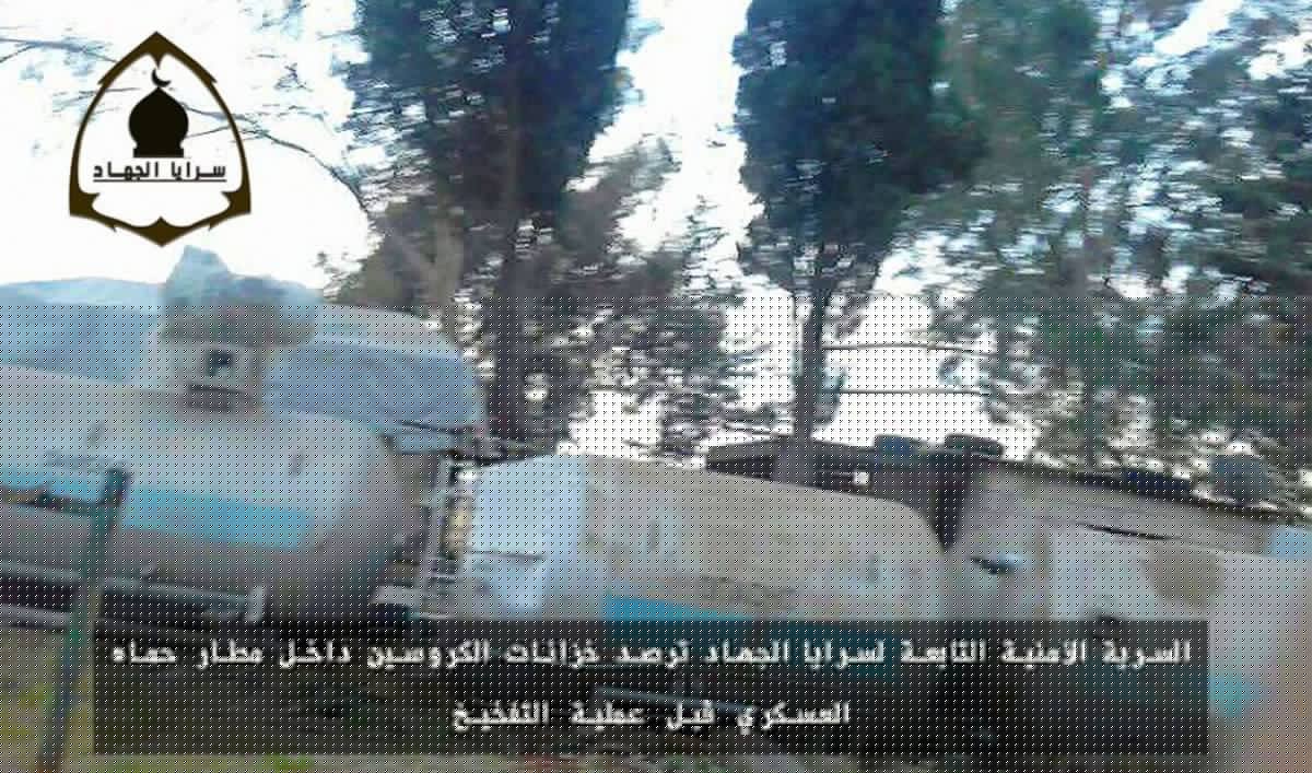 *- ארגון אלמוני בשם ” סראיא אלג’יהד – פלוגות הג’יהד” נטלו אחריות לפיצוצים העזים שהתרחשו בשדה התעופה הצבאי בעיר חמאת ביום שישי בצהרים .הם טוענים כי אנשיהם הצליחו להסתנן לתוך הבסיס ולצלם את האובייקטים שהם פוצצו אחר כך .