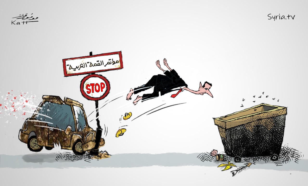 קריקטורות הפסגה הערבית שולחת את הנשיא אסד למקום הראוי לו , לפח הזבל 09/09/202209/09/2022 Nziv סוריה קרדיט: סוריה טי וי
