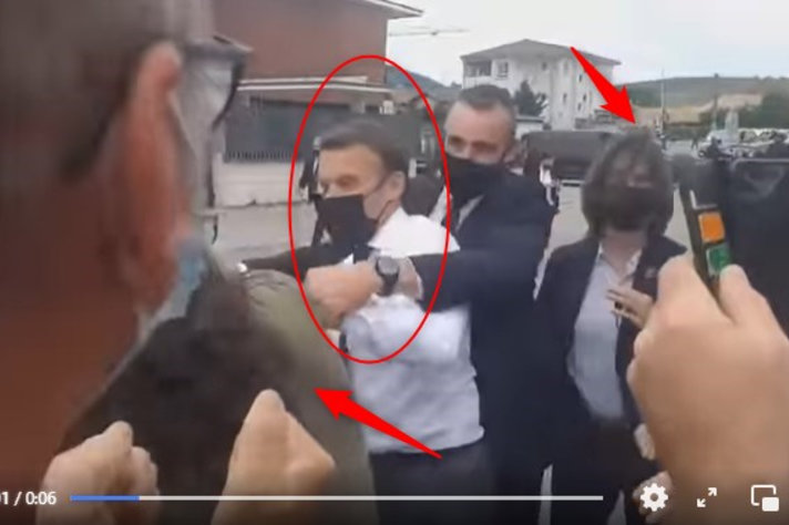 בסרטון נראה נשיא צרפת עמנואל מקרון עוטה מסכה שחורה מלווה באנשי אבטחה, ולפניו קבוצת אנשים המופרדת בגדר ברזל, ואחד מהם פוגע בפניו.