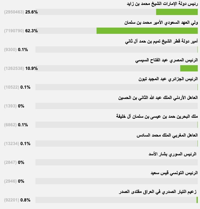 עד כה, יורש העצר הסעודי, מוחמד בן סלמאן, הגיע למקום הראשון, עם שיעור של 62.3%, אחריו נשיא איחוד האמירויות, מוחמד בן זאיד, עם שיעור של 25.6%, ולאחר מכן נשיא מצרים עבד אל-פתאח אל-סיסי, עם שיעור של 10.9 אחוזים.