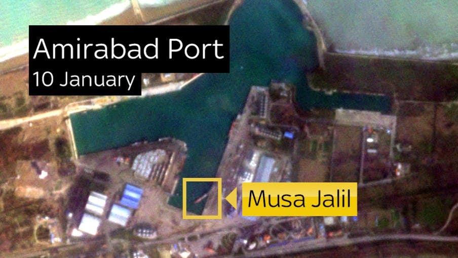 אתר העוקב אחרי תנועות הספנות העולמית – MarineTraffic הבחין בשתי הספינות בנמל אמיראבאד של איראן בים הכספי ב-9 בינואר. תמונות לוויין מיום המחרת שהגיעו לידי הרשת מראות שלפחות אחת מהספינות עדיין נמצאת בנמל. על פי נתוני המעקב הימי, אניית ה-Musa Jalil יצאה מהנמל בסביבות השעה 10 בבוקר שעון מקומי ב-10 בינואר.