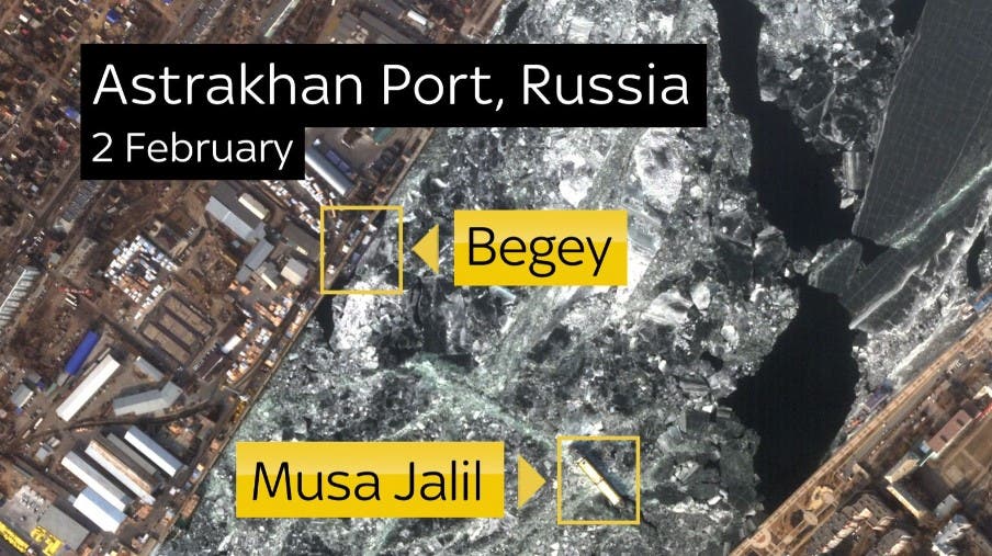 ב-12 בינואר, שוב על פי נתוני המעקב, שתי הספינות עצרו מול חופי טורקמניסטן לכמה ימים, ואז הפליגו על פני הים הכספי והגיעו לנמל הרוסי אסטרחאן ב-27 בינואר. הן שהו בנמל מספר ימים לפני שעזבו ב-3 בפברואר, על פי נתוני המעקב.
