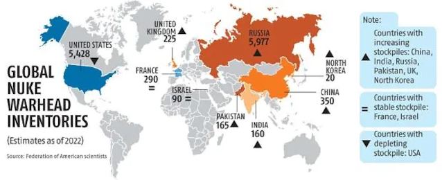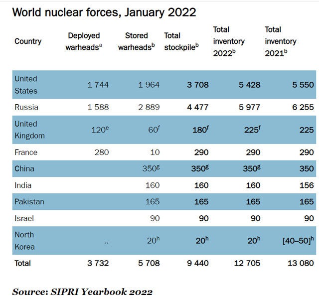 הדו”ח ציין את המאגר העדכני של פצצות הגרעין בעולם לשנת 2022 לפי הסדר הבא: