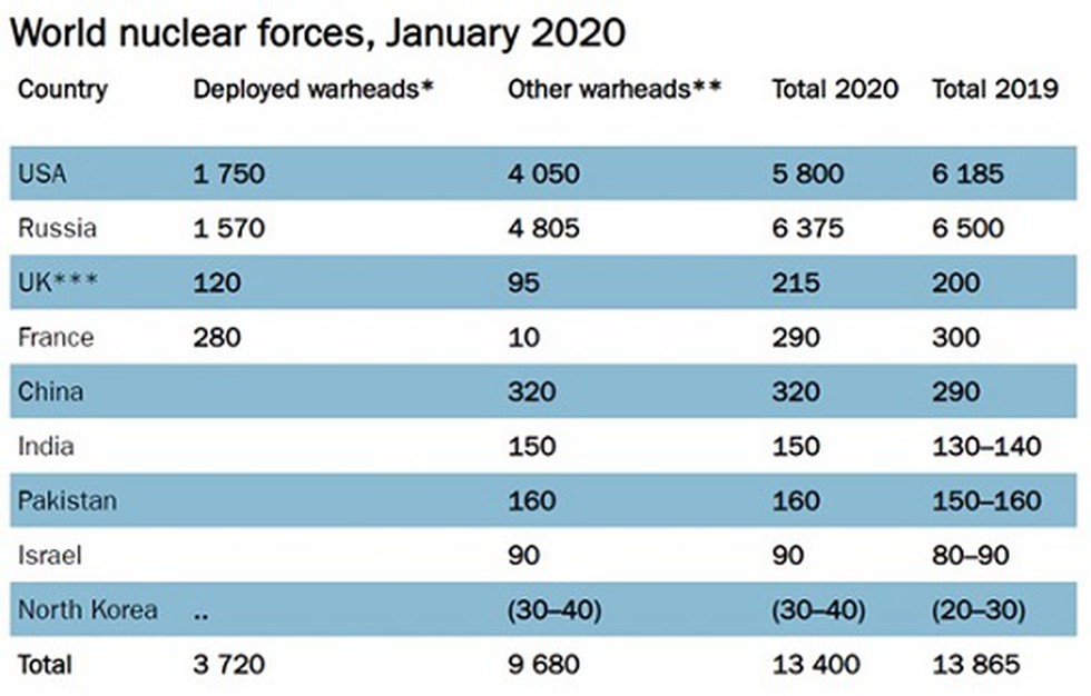 מלאי פצצות הגרעין בעולם לשנת 2020: