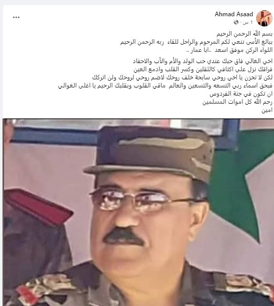 רשתות חברתיות המקורבות למשטר אסד ספדו לאלוף “מואפק אסאעד”, שהיה ידוע במעשים האכזריים שביצע נגד העם הסורי שכלל השמדת ערים ועיירות מורדיות על תושביהן וביצוע אינספור מעשי טבח בכל רחבי המדינה.