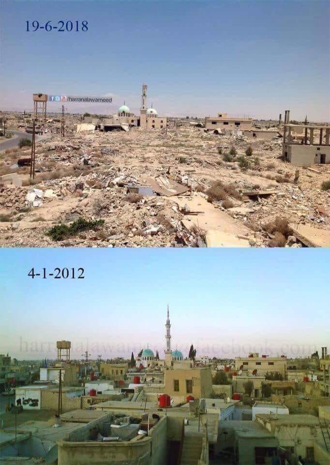 תמונת העיירה בצר אלחריר בדרום סוריה בשנת 2012 וכיום: