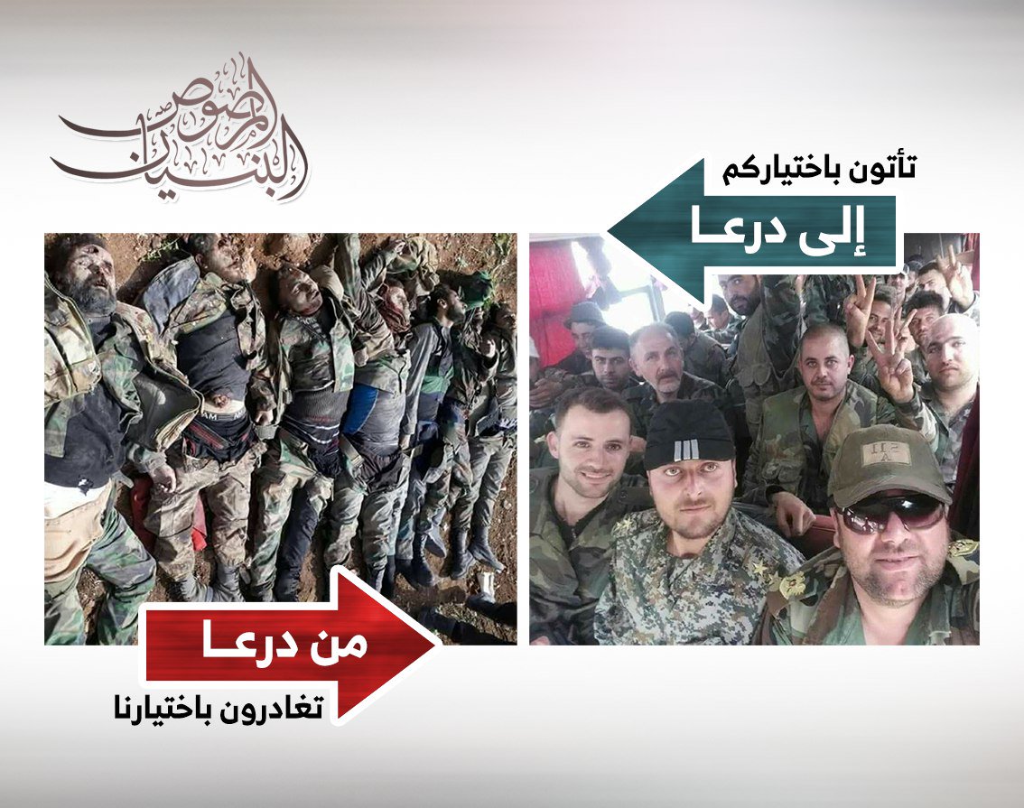 *-המורדים שלפו תמונה ממכשיר סלולר שנמצא על גופת חייל סורי שהגיע עם חבריו להילחם בדרום המדינה. רוב אלו שבתמונה נהרגו. המורדים רכזו את גופות החיילים הסורים שנהרגו ונראים בתמונה והפיצו אותה תחת הכותרת : ככה הגיעו לדרעא וככה הם יוצאים ממנה.