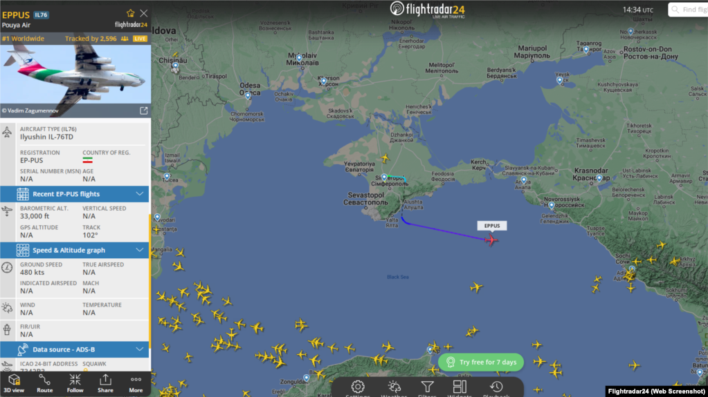 האתר האוקראיני Pravda, המצטט את נתוני האתר השבדי “Flight Radar 24”, המנטר את התנועה האווירית, כתב כי מטוס האיליושין 76 של החברה האיראנית, המריא ,שעתיים לאחר שנחת בשדה התעופה של העיר סימפרופול, בשעה 17 :09 בערב משדה התעופה הזה.